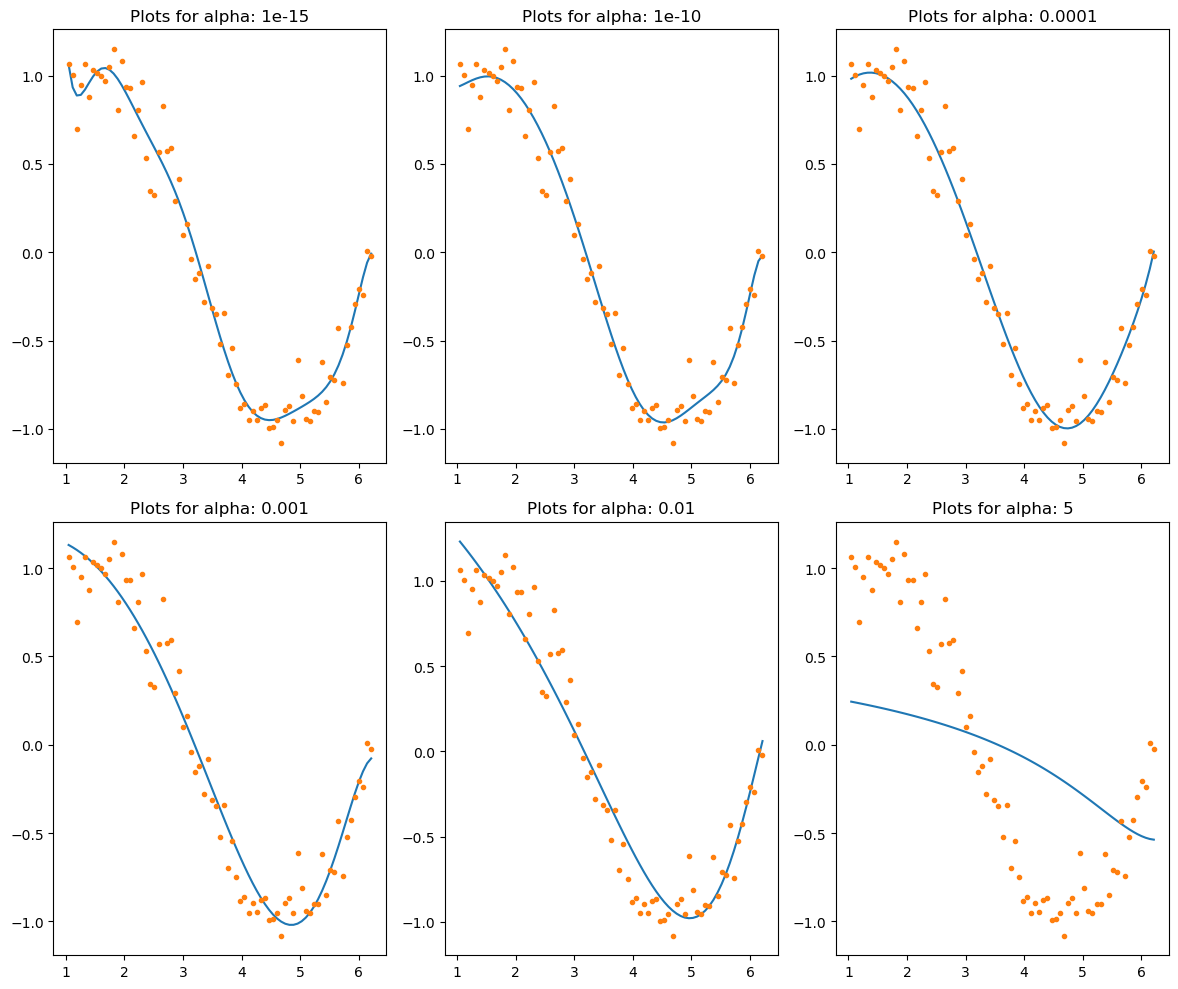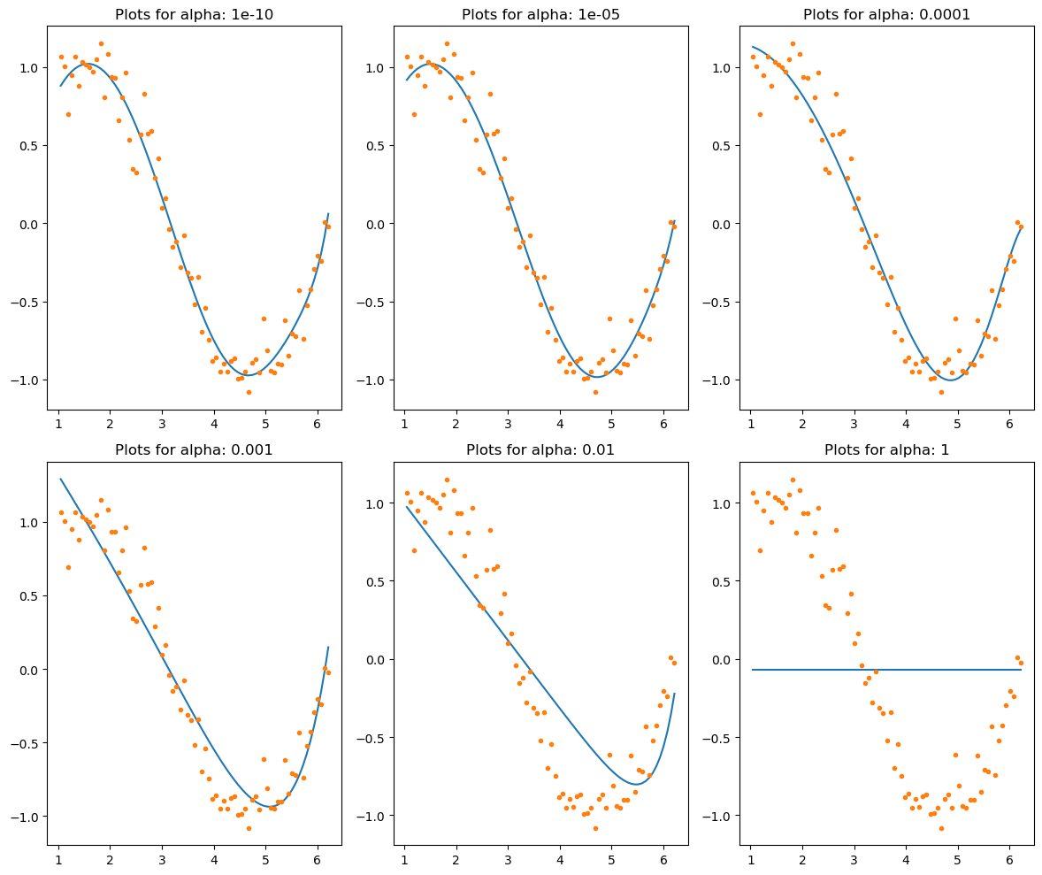 릿지 회귀에서 α는 일반 선형 회귀에서와 같이 0이 됩니다. 즉, 정규화가 없습니다. 따라서 모델의 가중치를 자유롭게 조정할 수 있습니다. 그러나 α가 커질수록 regularization strength는 증가하고 weight 값은 감소한다. 이는 모델에서 각 변수의 영향을 줄이기 위한 것입니다.