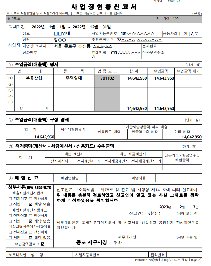 부가가치세 면세수입금액이 있는 개인사업자(안내문을 받지 않은 사업자 포함)는 22년 귀속수입금액 등 사업장 현황을 2월 10일(금)까지 신고하여야 합니다.신고대상 업종은 주택임대업, 주택매매업, 병·의원, 학원, 농·축·수산물 도소매업, 화원, 어업, 장례식장, 독서실, 직업소개소, 과외교사, 출판사 및 서점 등 부가가치세를 면세받는 개인사업자입니다. 사업장 현황 신고 방법은?
