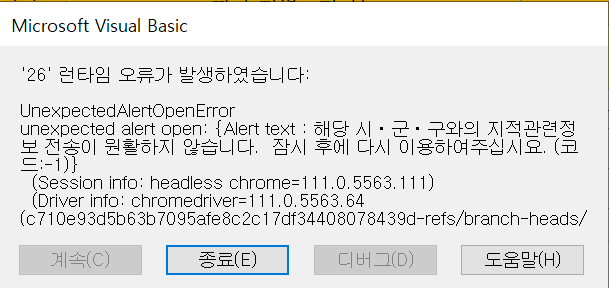 에러코드 26번은 UnexpectedAlertOpenError인데 실제 웹페이지에 뜨는 메시지 팝업입니다.
